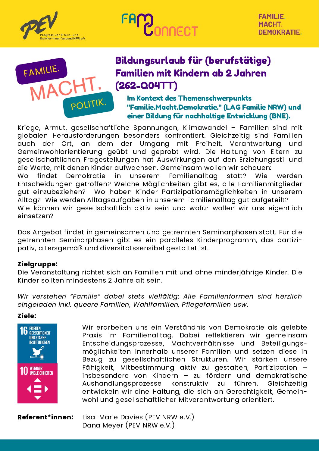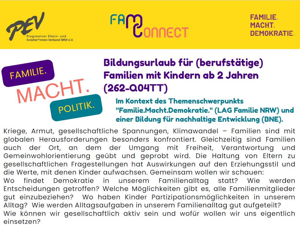 Das Angebot ist eingebettet in den Themenschwerpunkt Familie.Macht.Demokratie. der LAG Familie NRW und versteht Familie bewusst vielfältig.